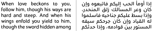 For the Latin equivalent, we used a new approach to achieve balance between both scripts, especially for body text setting. When we tried using the same stroke thickness, an 8 to 12 pt Arabic body text set against an English equivalent seemed slightly lighter. Taking into consideration the difference in structure between Arabic and Latin scripts, we aimed to visually compensate for the wider and more generous white space inherent in a connected script such as the former by slightly reducing the stroke thickness of the latter. We also slightly increased the spacing of the Latin character set so that it maintains the same rhythm as the Arabic. In this respect, Boutros Almond Latin was created to complement Boutros Almond Arabic. In the Latin display version however, this compensation was not necessary.